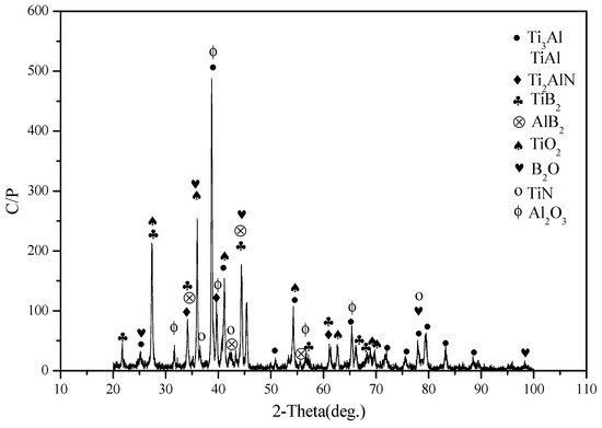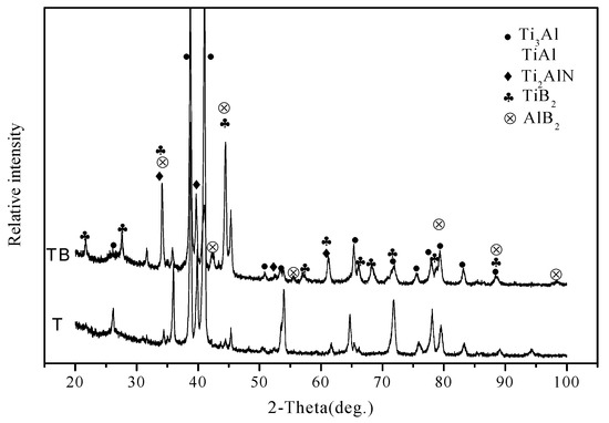 Figure 2 shows the XRD patterns of specimens. The main phases of specimen T are Ti3Al and TiAl. This indicates that the Ti element fully reacts with the Al element due to the high-temperature solid solution reaction. At high temperatures, N2 reacts with Ti and Al elements, forming Ti2AlN as a secondary phase of the alloy. Some corresponding peaks are detected in the figure. The Ti2AlN phase belongs to the MAX phase which has high-temperature plasticity, a high elasticity modulus, and layer structure [24,25]. The Ti2AlN phase can improve the toughness and tribological properties of titanium alloys to some degree. With the addition of boron, Ti and Al elements react and form Ti2B and Al2B phases that reinforce the mechanical properties and wear resistance of the alloy. According to the XRD result, it is confirmed that the phases of TB consist of Ti3Al, TiAl, Ti2AlN, TiB2, and AlB2. And therefore, the reactions are as follows: