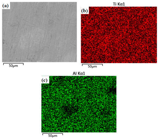 Microstructure and EDS element distribution maps of the Ti–Al alloy (T): (a) Microstructure, (b) Ti and (c) Al.