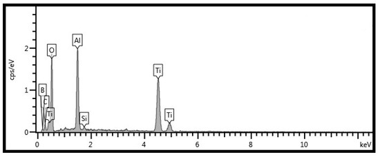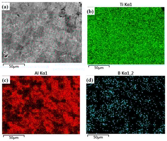 Microstructure and element distribution maps of specimen T are given in Figure 3. A crack or hole is not found on the surface. The microstructure of T is compacted. The Ti or Al element does not agglomerate, according to the EDS results (see Figure 3b,c). This means that the distribution of TiAl compounds is uniform in the matrix (see Figure 2). Figure 4 shows the microstructure and element distribution maps of TB. The microstructure of TB is different from that of T due to the addition of boron. The light gray area is the Al-rich phase which includes AlB2 and Ti(Al) phases. The B-rich area is mainly located in the gray area. According to the results of XRD, the TiB2 phase is located in the gray area. The TiB2 phase forms a network in the matrix.