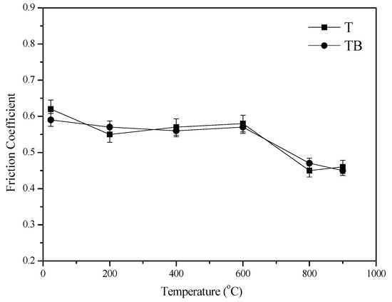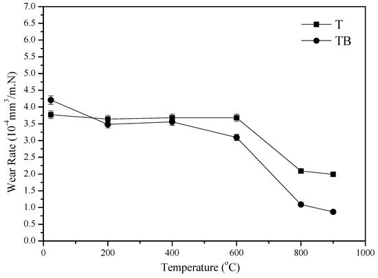 The friction coefficients and wear rates of alloys fluctuate with testing temperatures. When the temperature is low, it is difficult for a small amount of oxides to form stable oxide film on the contact surfaces of specimens [26,27]. At elevated temperatures, metallic oxides increase (see Figure 7). The speed of oxidation is greater than that of oxide removal. So, large amounts of oxides are compacted in order to form more compacted and continuous oxide film on the wear tracks as the temperature rises (see Figure 8). The oxide film protects materials from oxidation at high temperatures. Additionally, the oxide film separates the contact surfaces of counterparts during sliding, adding the lubricating effect. The high coverage of oxide film leads to low wear rates and friction coefficients [28,29]. Consequently, the friction coefficient and wear rate of the alloys decreases as testing temperature increases. Hardness is an important parameter that obviously influences wear resistance of materials [11,30,31]. The formation of TiB2 and AlB2 phases increases the mechanical properties of the alloy. Meanwhile, the network TiB2 phase effectively sustains the external load during friction. The relatively soft phases in the matrix avoid severe wear [11]. Secondly, material with high deformation resistance easily forms stable oxide film on the wear tracks at high temperatures due to the high hardness. Thus, TB has better friction and wear performance than those of T at testing temperatures.