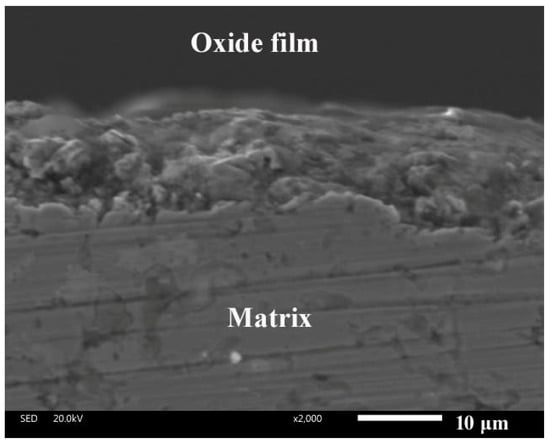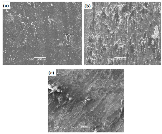 Figure 9 gives the SEM images of worn surface morphologies of T at different temperatures sliding against the Si3N4 ball. The wear track of the specimen is relatively smooth at room temperature (see Figure 9a). Much wear debris is noted on the wear track. The Ti–Al alloy has a hard and brittle nature. Due to the effect of alternate stress, the material peels off from the contact surfaces and becomes tiny wear debris as the third body [32]. This indicates that T shows fatigue wear at room temperature. At 600 and 900 °C, oxide film and a slight groove are found on the wear tracks of the alloys (see Figure 9b,c). The oxidation reaction of the elements and wear debris is sped up. These oxides form stable oxide film on the wear tracks. The oxide film becomes more and more compacted and continuous on the surfaces with the increase of temperature, resulting in a lower wear rate and friction coefficient of the alloys at high temperatures. The main wear mechanism of T is oxidative wear at 600 and 900 °C.