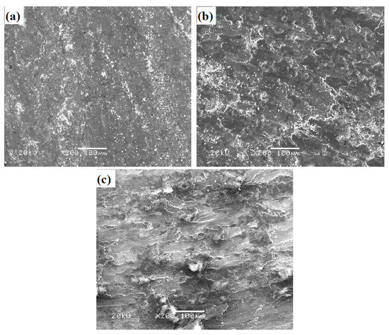SEM images of worn surface morphologies of T: (a) room temperature (RT), (b) 600 °C, and (c) 900 °C.