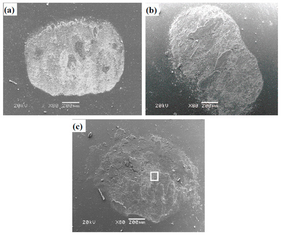 SEM images of worn surface morphologies of Si3N4 ceramic balls sliding against TB: (a) RT, (b) 600 °C, and (c) 900 °C.