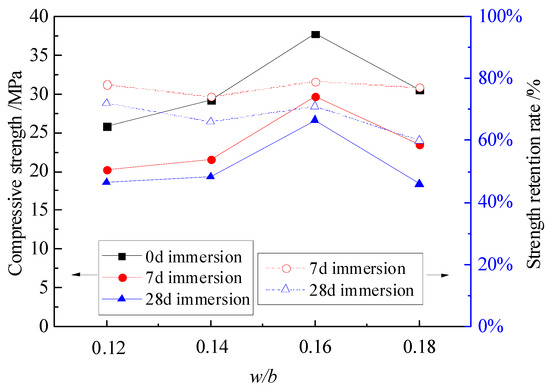 Figure 1 shows the compressive strength and strength retention rate curves of MPC mortar with different w/b ratios. With the increase of w/b from 0.12 to 0.18, the compressive strength showed a curve with one peak. The maximum compressive strength occurred at w/b = 0.16, that is 37.7 MPa, 29.7 MPa and 26.6 MPa for specimens without immersion, with 7 days of immersion and with 28 days of immersion, respectively. The moderately reduced to 74.0% and 66.1% for specimens with 7 days and 28 days of immersion at w/b = 0.14, respectively. However, increasing the w/b from 0.14 to 0.16, the of specimens with 7 days and 28 days of immersion gradually increased to 78.8% and 70.6% at w/b = 0.16, and then decreased to 76.7% and 60.3% at w/b = 0.18. Since a balance of w/b exists in the work ability of fresh mortar and compressive strength of hardened mortar, the 0.16 is a reasonable w/b to guarantee desirable work ability as well as a good compactness of the interior structure of MPC mortar. Therefore, the maximum compressive strength and were achieved at w/b = 0.16.