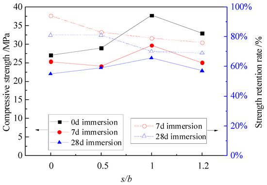 Figure 2 shows the compressive strength and strength retention rate curves of MPC mortar with different s/b ratios. The s/b ratio plays a dominant role in the fluidity of mortar. Fluidity is closely related to the interior structure of hardened MPC mortar. The best fluidity was observed in the specimens with s/b = 1.0 in this condition, the compressive strength was reached to the maximum of 37.7 MPa, 29.7 MPa and 26.3 MPa for specimens without immersion, with 7 days of immersion and with 28 days of immersion, respectively. However, increasing s/b from 0 to 1.2 resulted in a descent trend of strength retention rate. Compared to specimens with s/b = 0, the strength retention rates of specimens with s/b = 1.2 were decreased by 18% and 12% after 7 days and 28 days of immersion, respectively. Therefore, it can be deduced that the higher s/b exerted more negative effect on the interior structure as well as the water stability of the MPC mortar.