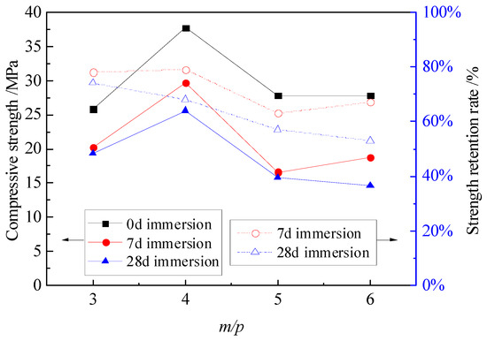 Figure 3 shows the compressive strength and strength retention rate curves of the MPC mortar specimens with different m/p. Increasing the m/p up to 4 led to an expansion effect on the interior structures of the MPC mortar, and thus the compressive strength was improved to 37.7 MPa, 29.7 MPa and 25.6 MPa for specimens without immersion, with 7 days of immersion and with 28 days of immersion. When m/p increased from 4 to 6, the expansion effect was diminished, while the drying shrinkage effect occurred. The drying shrinkage effect was caused by the accelerated setting time at curing, which eventually resulted in a poor interior structure of hydration product of the MPC mortar. For this reason, the compressive strength of the specimens with or without immersion was dramatically reduced, even close to or lower than that of specimens with m/p = 3. The m/p has a strong effect on drying shrinkage and setting time during the curing of the MPC mortar. Thus, the increase of m/p will accelerate the setting time and results in a poor interior structure of hydration product of the MPC mortar. Although the expansion effect is more influential on compressive strength, the strength retention rate was not significantly influenced at m/p for specimens with 7 days and 28 days of immersion, and generally showed a downward trend with m/p up to 6.