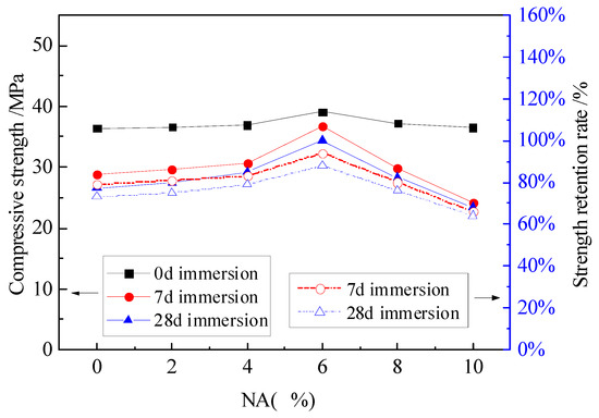 Figure 4 shows that a small dosage of NA, within 4%, has little effect on the compressive strength and strength retention rate. However, when the NA dosage increased from 4% to 6%, the compressive strength was significantly improved to 39.1 MPa, 36.7 MPa and 34.4 MPa for specimens without immersion, with 7 days of immersion and with 28 days of immersion, respectively; while the strength retention rates were improved to 94% and 88% for specimens with 7 days and 28 days of immersion.