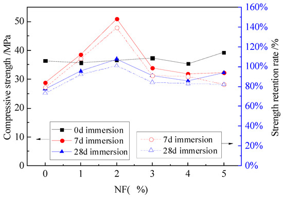As Figure 5 indicates, the addition of NF has little effect on the compressive strength of specimens without immersion, but 2% NF would greatly improve the compressive strength and strength retention ratio for specimens with 7 days and 28 days of immersion. Compared to specimens without NF, a total of 60% and 28% increase in compressive strength were noticed for specimens with 7 days and 28 days of immersion, respectively. A similar increase was also found in the strength retention ratio. However, with 3% or more NF used, the specimen performed a sharp decrease in compressive strength and strength retention, which are little higher than specimens without NF.