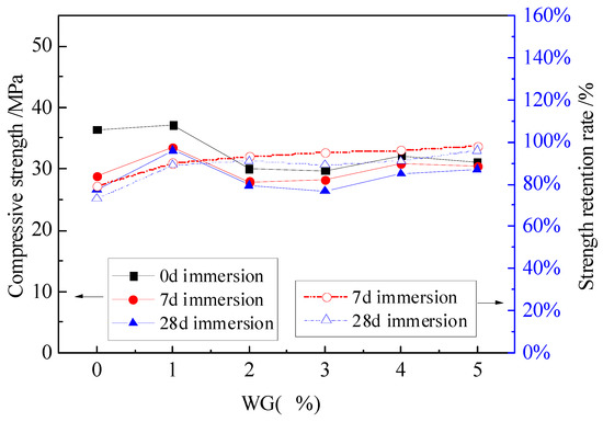The obvious increase of compressive strength only exists in the specimens with 1% WG. The increased compressive strength is 33.4 MPa and 33 MPa for specimens with 7 days and 28 days of immersion, respectively, as shown in Figure 6, but the increase was reduced when 2% WG was added. Increasing WG from 2% to 5% appeared to have little effect on the compressive strength, which is similar with the results of specimens without WG. Nevertheless, the strength retention ratio always increased for specimens with WG from 0% to 5%, but the increase is implicit for specimens with 3% to 5% WG. Compared to specimens without WG, a total of 19% increase was obtained for specimens with WG up to 5%. Therefore, with the consideration of economy and performance, 1%–3% WG tends to be suitable to improve the compressive strength and water stability of the MPC mortar.