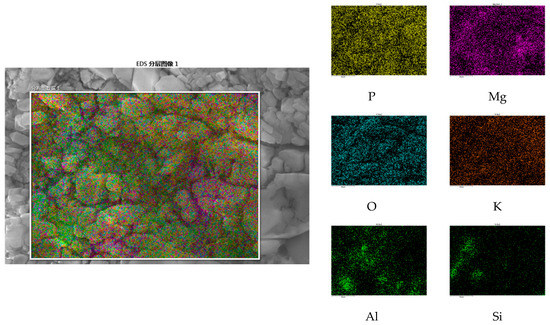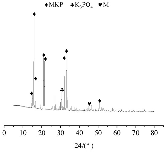 Figure 8 shows the XRD spectrum of the deposits. The main extract compositions are MgKPO4·6H2O (MKP), MgO and K3PO4. The structure of MKP and MgO provides the strength of the MPC paste [60]. During the immersion, the P was dissolved and it decreased the pH value of the water solution. Therefore, the hydration reaction proceeded in the opposite direction. The MKP decomposed and the MgO dissolved in a small amount. The concentration of , and in the water gradually increased until the recrystallization condition of MKP was reached.
