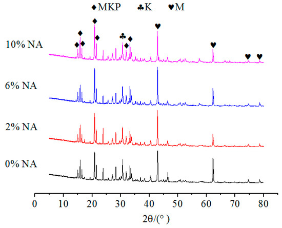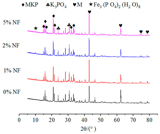 No matter the NA or NF was added or not, the types of hydration products are not affected. This is due to the fact that the main structural support inside the MPC is a stacked structure of MgO wrapped by MKP. Therefore, the relative contents of MgO and MKP, as well as the environmental conditions that promoted the formation of MKP, should be considered to judge the density of the interior structure and the compressive strength of MPC. In addition, Figure 8, Figure 9 and Figure 10 show that the curves for specimens without or with NA or NF almost have no difference. A possible situation for this reason is that the amount of NA or NF is small, and the artificial stirring error is large, so the uniformity of sampling is greatly fluctuated. In Figure 9, another new crystal was found in the XRD patterns, and the influence of NA and NF on the interior microstructure of specimens was observed by SEM. Both of Na2B4O7·10H2O and MgO were manifested in each curve in Figure 8, Figure 9 and Figure 10, which indicates that Na2B4O7·10H2O plays a positive role in retarding the ionization of MgO, contacting of phosphate and prolonging the setting time.