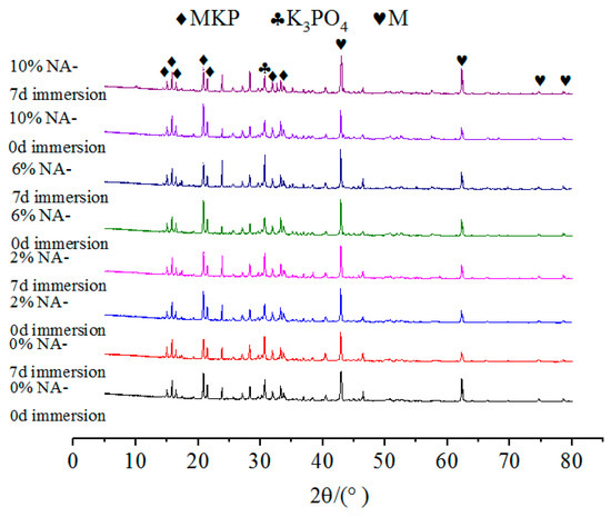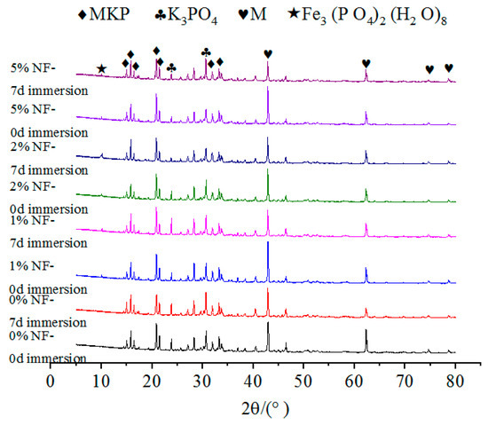 It can be seen from Figure 12, Figure 13 and Figure 14 that for specimens with the same dosage of NA or NF, the main difference of the XRD spectrum is reflected in the relative content of MgO and MKP. After 7 days of immersion, the relative content of MKP decreased to a certain extent. This also confirms that the water stability of MPC is related to the dosages of NA or NF.