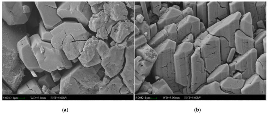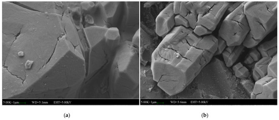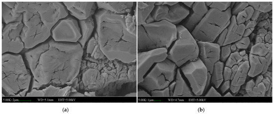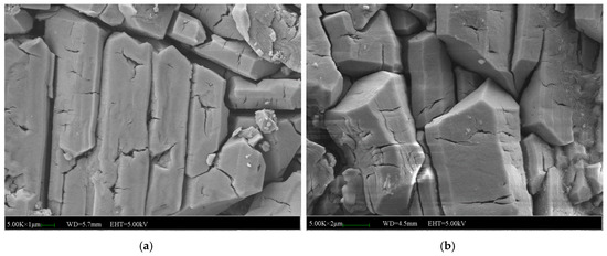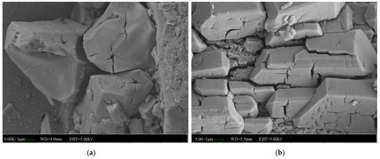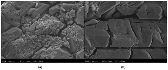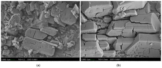 Figure 15 shows the micromorphology of the specimens without NA, NF and WG. It can be seen from Figure 15a that a large number of columnar and plate-like bodies of MKP crystals were crossing each other to form a network structure for the specimens without immersion. After 7 days of immersion, the MKP crystals expanded and a few of the fine cracks among the MKP crystals began to propagate in depth and width until the network structure was destroyed, as shown in Figure 15b. It was noticed that the expansion of the cracks usually started from the large gaps among the MKP crystals, which indirectly indicates that the compactness of the matrix and the MKP crystals arrangement determines the water stability. It can be concluded that the microstructure of specimens without NA, NF and WG that were subjected to 7 days of immersion will be broke down and eventually lead to the weakness of compressive strength.