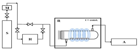 The scheme of installation to the photocatalytic removal of NOx (S—the source of pollution; M—mass flower; H—humidifier; R—photocatalytic reactor with irradiation source; A—NOx analyzer).