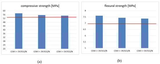 (a) Compressive and (b) flexural strength of CEM I 42.5 N with the addition of 1, 3, and 5 wt % of photocatalyst TiO2/N. In the red line, the compressive strength (53 MPa) and flexural strength (6.92 MPa) of pure CEM I 42.5 was presented.