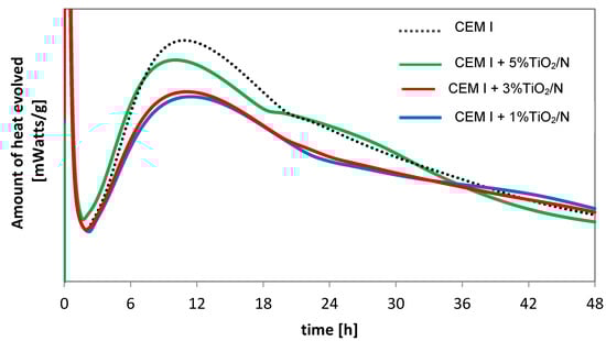 According to the literature, there are five stages of heat for a typical Portland cement [,]. The addition of modified titanium dioxide into the cement influences hydration heat; the paste with the addition of TiO2/N showed less heat generated up to 20 h compared to the unmodified cement.