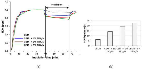 (a) Graph of NOx [ppm] decomposition and (b) NOx degradation [%] on CEM I samples, and cements modified by the addition of 1, 3, and 5 wt % of TiO2/N under UV light irradiation.