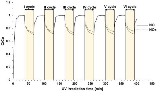 In Figure 5, the lifetime of tested modified cement plates was presented. As it can be seen, there was no decrease in the photocatalytic activity of the modified cement plates. NO removal and total NOx removal are on the same level. There are only small differences between NO and NOx concentration, and this behavior suggests that with time (increasing the number of cycles), more NO2 is produced.