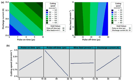 (a) Contour plot of the cutting speed; (b) Main effect plot for the cutting speed.