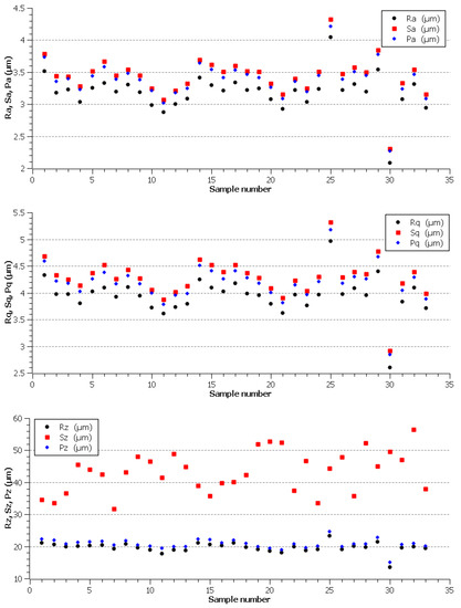 Typically, the topography of the machined surface is carefully monitored because it must meet the values prescribed in the manufacturing documentation of the individual parts. The expected surface quality values are usually prescribed by the machine tool manufacturer only in the form of arithmetical mean deviation of profile (Ra) for the production technologies for individual materials and their thickness. However, there are many materials that are not included in these manufacturing technologies and Hardox is one of these examples. The analysis of the surface topography following the machine parameters setup is therefore necessary, especially when the part is only machined with WEDM without further finishing (e.g., grinding). For this reason, three parameters of the basic profile, three profile parameters, and their three surface equivalents were evaluated in this experiment, which provide quantitative evaluation of the area by all technically significant directions [18]. The basic profile parameters evaluated were Pa, Pz, and Pq. The parameters evaluated by the profile method were Ra, Rz, and Rq. The arithmetical Sa, Sz and Sq were evaluated by a planar method. All parameters were evaluated using the non−contact 3D profilometer Taylor Hobson Talysurf CCI Lite according to the corresponding standard for the surface parameters ISO 25178−2 [19] and profile ISO 4287 [20]. All parameters were evaluated on 1024 profiles of a single evaluation length Profile Length Ratio l = 0.8 mm obtained from S−F surfaces of measurements made with the 20× objective. Five random spots on each sample were selected for the measurement, followed by an average of these values.