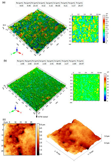 (a) the evaluated surface topography parameters of Sample 25, including color−filtered relief of its surface; (b) evaluated surface topography parameters of Sample 30, including a color−filtered relief of its surface; (c) 3D relief of Sample 30 from a given area obtained by AFM.