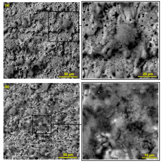 The surface morphology and possible surface or subsurface defects are the key parameters determining the final quality of the machined surface. The study of the surface morphology of all machined samples was performed by electron microscopy. In all cases, a BSE backscatter detector was used for imaging, and the samples were always studied at a magnification of 1000×, 2500× and then 4000×. The appearance of the morphology of Sample 30 with the lowest roughness values is shown in Figure 6a, showing a large number of tiny black dots in the image, which represent tiny holes, which are more visible in the detailed image. The surface is relatively smooth, especially when compared to the surface of Sample 25 (the highest roughness values) shown in Figure 6b. This and almost all other produced samples are covered with a recast layer formed by a structure that is specific to special types of steels such as Hadfield [24].