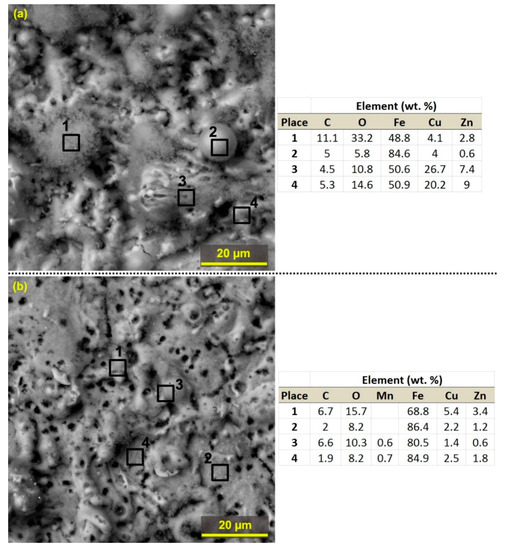 Due to the very high temperatures, massive diffusion processes between the wire electrode and the workpiece material occur during the WEDM process, which has been presented in connection with the processing of various materials such as martensitic stainless steel [25], ASP 23 steel [26], aluminum alloys 7475−T7351 [15] or Inconel 625 [23], however, the machine parameter setup was found to have no diffusion and the workpiece surface was not contaminated with wire electrode elements (copper and zinc). With this presented research, it can be said that diffusion contamination can only be completely eliminated by optimizing the machine parameters setup. Furthermore, no diffusion processes in the machining of highly oriented pyrolytic graphite (HOPG) [27] were also studied. Figure 7 shows the individual places of the chemical composition analysis on the surfaces of Sample 25 (sample with the highest roughness values) and 30 (sample with the lowest roughness values), with the measurements showing that the individual formations on the surface 25 are created mostly of copper and zinc diffused from the wire electrode than the individual places examined on Sample 30. Most of copper and zinc were measured on Place 1 (Figure 7b) but this value was only 5.4 wt.% of copper and 3.4 wt.% of zinc. In the other three measured places, the occurrence of copper was always below 2.5 wt.% of copper and 1.8 wt.% of zinc. Another interesting place of measurement (Place 2) shown in Figure 7a was an adherent globule of debris, composed mainly of iron. In contrast, Place 1 is a visibly oxidized place because the oxygen content of 33.2 wt.% was detected here.