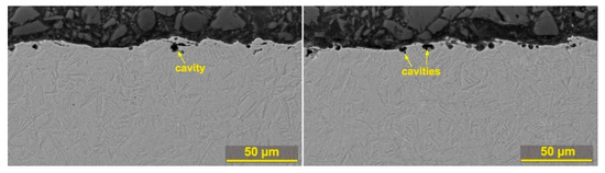 The cross section analysis showed an occurrence of a large number of defects, both in the form of cracks and burnt cavities. The formation of burnt cavities is caused by high temperatures at the point of cut, with water dissociation in the water dielectric bath of the machine and the diffusion of atomic hydrogen below the surface of the machined material. These defects are shown in Figure 8, including their dimensions that range within microns. The longest crack had a length of 22 µm and is shown in Figure 8e. Longer cracks have only been studied with WEDM of pure molybdenum [28]. Obviously, these defects will further disrupt the integrity of the surface layer and may also cause the initialization of much larger cracks across the entire produced sample. The only sample on which only a few small burnt cavities were found is Sample 30, whose subsurface area is shown in Figure 9. This sample also shows that the recast layer is significantly thinner (max up to 5 µm) compared to all other samples, and there is no other on 80% of the entire sample surface. Other specimens have a recast layer of up to 20 µm on their entire surface.