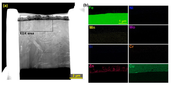 The chemical composition analysis of the prepared TEM showed a homogeneous distribution of elements in the base material, with the recast layer being the only area with different element concentrations. Figure 10a shows the produced lamella and the EDX analysis area, which was shown in the form of individual element distribution maps in Figure 10b. A smaller area than the entire area of the lamella was chosen to increase the accuracy of the individual elements. It is apparent from the EDX analysis that in the recast layer the base material was mixed with the electrode material, i.e. copper and zinc. In addition, the local concentration of the chemical elements of the base material in the recast layer has also changed. The concentration was increased in the elements: manganese, chromium, carbon, silicon, molybdenum, and nickel except for iron. For silicon, copper and manganese, the highest concentration was detected at the interface of the recast layer and the base material. A small amount of the observed copper on the surface of the lamella is caused by the secondary transfer of the material from the recast layer during the dedusting.