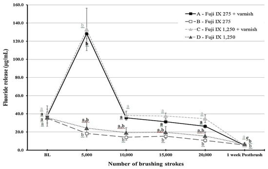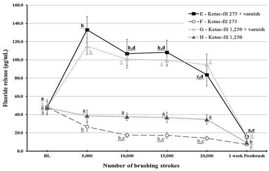 Fluoride release was different for each time point depending on the group (p < 0.001). Figure 1 and Figure 2 show statistical comparisons for F9 and KF groups over time, respectively. The highest fluoride release values were recorded at 5000 strokes in the varnish groups of each material. For F9, fluoride release values sharply decreased after 10,000 strokes for the varnish groups (groups A and C) and remained low throughout the study period for the other two groups (B and D). Regarding KF, the varnish groups (E and G) released more fluoride compared to the non-varnish groups (F and H) as long as the brushing protocol continued. Post-brushing fluoride release after week 1 was lower than the baseline values for all groups.
