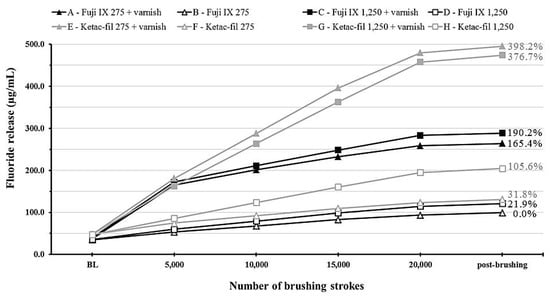 - Nassar, H.M.; Platt, J.A. Effect of brushing with two different abrasives on fluoride release by high-viscosity glass ionomer cement. J. Oral Sci. 2015, 57, 379–384. [Google Scholar] [CrossRef] [PubMed]
