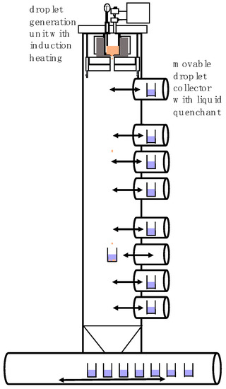 The single droplet generator [22] was mounted in a chamber with a height of 6.5 m and was equipped with different height movable droplet collectors filled with a quenching liquid. It was therefore possible to collect droplets in different states (liquid, semi-solid, or solid). In the upper part of the tower, there was the droplet generation unit in which the feedstock material was molten and droplets were produced. The crucibles were made of ceramic or graphite as required by the melt. During the process the crucible, containing the melt material, was heated up indirectly via an induction furnace. The melt oscillations were avoided by using indirect heating method which resulted in stable droplet generation. The temperature of the melt was controlled using a Type B thermocouple during the whole process and the entire chamber was purged with nitrogen, argon, or helium. A schematic of the droplet generator is shown in Figure 1.