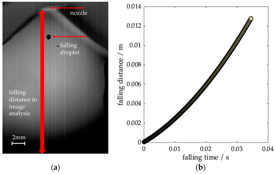 In the present work, the cooling rate of single metal droplets, generated via the drop-on-demand process, was investigated theoretically and experimentally. For this purpose, experiments were carried out with two different alloys, AlCu4.5 and CuSn6, which have different thermophysical properties. In the experiments, droplets with different diameters were generated and the droplets were further solidified to form spherical particles. In order to model the cooling rate of the particles, their size and velocity were initially taken into account. The Malvern Morphology G3 system (Software Version 8.23, Malvern Panalytical GmbH, 34123 Kassel, Germany) was used to determine the size distribution of the particles and a high-speed camera was applied to determine the initial velocity of the droplet, which was used as the initial boundary condition for the solution of the trajectory in Equation (3).