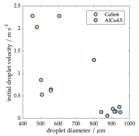 Droplets were produced at different droplet generation conditions via the drop-on-demand process (a detailed list of process conditions can be found in Table A2 and Table A3). Small droplets were generated in an ejection mode as they were formed inside the nozzle. The droplet formation mode changed to the jetting mode when the formation time was increased. In the jetting mode, a droplet was separated from a ligament outside the nozzle via inertia forces [22]. As a result, bigger droplets were formed. Since more energy was needed to create the surface energy of the ligament, less energy was available for the initial kinetic energy of the droplet. This effect is clearly visible in Figure 4 for the CuSn6 droplets, while most of the aluminum droplets are close to the minimum. As a result, we were able to analyze droplets of similar sizes, but with a very different initial velocity to study its effect.