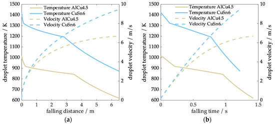 In Figure 6, the temperature and velocity are plotted as a function of falling distance (Figure 6a) and falling time (Figure 6b) for an AlCu4.5 and a CuSn6 particle (dp = 800 µm). The cooling rate was calculated with an initial velocity of 0.2 ms−1 and a superheat temperature of 100 K. The particles fell all along the tower and therefore had a maximum falling distance of 6.5 m. Inspection of the figure indicates that the CuSn6 droplets accelerate and fall faster due to the higher density and achieve a higher terminal velocity. Consequently, the velocity of the CuSn6 droplet still rises strongly, while the AlCu4.5 particle velocity slowly merges into the plateau. Accordingly, the fall time with CuSn6 was approximately 0.2 s shorter. The thermal history clearly showed the solidification between liquidus and solidus temperature. For both alloys, the solidification time was similar. While latent heat of AlCu4.5 was about double that of CuSn6 and its specific heat was almost three times higher than that of CuSn6, its density was about 3.5 times lower and the temperature level during solidification was much lower. This leads to a decreased driving temperature difference for both convection and radiation and a lower convective heat transfer coefficient due to changes in gas properties with temperature. Since droplet velocities were higher for CuSn6, their solidification distance was slightly lower.