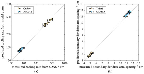 The results from SDAS analysis based on particle diameter are illustrated in Figure 5a. Each point represents the mean SDAS for 10 particles with the same diameter. For the AlCu4.5 particles, the SDAS ranges between 11.02 and 11.86 µm for particle diameters between 802 and 949 µm, respectively (AlCu4.5). For CuSn6, SDAS increases from 4.62 µm to 5.27 µm for particle diameters from 456 to 606 µm. For both alloys, we obtained a clear trend. Cooling rates obtained from SDAS are shown in Figure 5b. We obtained a cooling rate range between 300 and 450 Ks−1 for CuSn6 and from 80 to 100 Ks−1 for AlCu4.5. This allowed us to compare data in a wide range of cooling rates at different temperature levels with the predictions from the cooling rate model.
