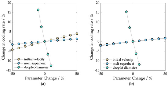Sensitivity of the cooling rate based on process parameters (initial velocity, melt superheat, and droplet diameter) for (a) CuSn6 and (b) AlCu4.5.