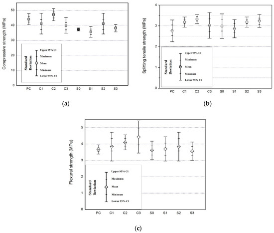 (a) The compressive strength of NSCFRC; (b) tensile splitting strength of NSCFRC; (c) The flexural strength of NSCFRC.