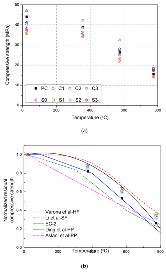 - Varona, F.B.; Baeza, F.J.; Bru, D.; Ivorra, S. Influence of high temperature on the mechanical properties of hybrid fiber reinforced normal and high strength concrete. Constr. Build. Mater. 2018, 159, 73–82. [Google Scholar] [CrossRef]