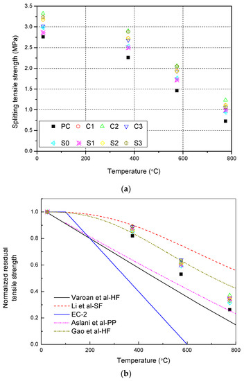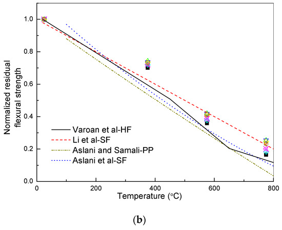 In Figure 5b, the experimental results for tensile strength were compared with other curves from previous studies. Included the Eurocode 2, the NSC with hybrid fiber by Varona et al. [30], steel fiber reinforced concrete by Li et al. [31], polypropylene fibers reinforced concrete by Aslani et al. [32], and HSC with hybrid fiber by Gao [34]. The experimental results showed that the residual tensile strength of NSCFRC was higher than that of EC-2, there is a significant difference between EC-2 and both the results and other curves. However, Figure 5b illustrates that the NSCFRC and other curves still have good residual tensile strength after the temperature exceeds 575 °C. The reason for such improvements could be attributed to the calcareous aggregates and fiber. Experimental results were similar to the prediction in Gao curve for HSC with hybrid fiber below 575 °C. The reason for it may be that NSC and NSCFRC had less internal porosity. However, at 775 °C, the residual tensile strength of NSCFRC is lower than Gao curve because carbon fiber has a deterioration of mechanical properties due to oxidation, and it cannot provide sufficient tensile strength above 575 °C. Therefore, steel fiber reinforced concrete has the highest residual tensile strength at 775 °C.
