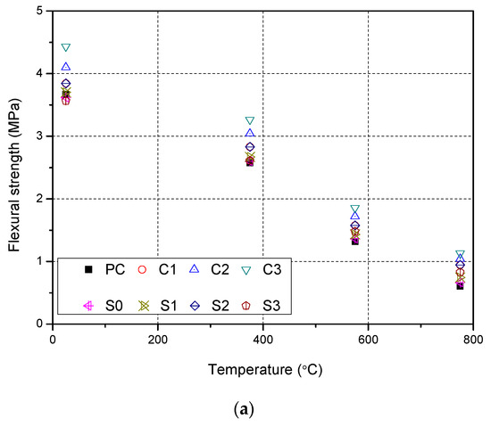 Figure 4a show that the compressive strength of concrete decreases with increasing temperature. The compressive strength decreased slightly at 375 °C and the normalized residual strength of all samples were greater than 88%. The normalized residual strength ranges from 60 to 69% at 575 °C, and the normalized residual strength is less than 45% at 775 °C. It can be seen that the presence of NS can effectively increase the residual compressive strength of concrete after high-temperature. After 775 °C, the compressive strength of S3 (0.15% CFs and 2% NS) is 17.3 MPa, which is lower than that of S2 (0.15% CFs and 1% NS) at 18.0 MPa. However, S3 provided the highest normalized residual compressive strength of 45.3%, 7.5% higher than S0 (0.15% CFs and 0% NS), and 10.2% higher than PC (0% CFs and 0% NS).