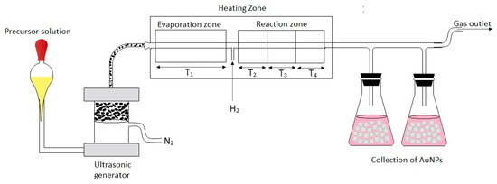 - Majerič, P.; Friedrich, B.; Rudolf, R. Au-nanoparticle synthesis via Ultrasonic Spray Pyrolysis with a separate evaporation zone. Mater. Tehnol. 2015, 49, 791–796. [Google Scholar] [CrossRef]