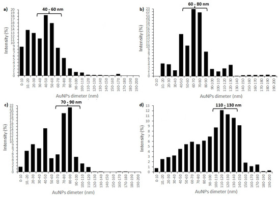 With DLS analysis several AuNPs’ characteristics can be revealed, such as shape, structure, hydrodynamic size and agglomeration state, by monitoring the Rayleigh scattering caused by the Brownian motion of AuNPs of a size smaller than the incident light wavelength at a fixed scattering angle [64,65]. DLS analysis of synthesised AuNPs revealed three different groups of AuNPs with different size distributions (in intensity percent) for AuNPs from all precursor solutions. Size distributions for AuNPs from precursor solution AuCl_1 revealed that group 1 contained 8.7% AuNPs with diameter < 10 nm, group 2 contained 56.2% AuNPs with a diameter between 10 and 50 nm, while group 3 contained 35.1% AuNPs with diameter > 50 nm. The average AuNPs’ size (together with Standard Deviation (SD)) of AuCl_1 was 57.2 ± 0.75 nm (Figure 3a). Size distributions for AuNPs from precursor solution AuCl_2 revealed that, in group 1, there were no AuNPs with diameter <10 nm, group 2 contained 24.5% AuNPs with a diameter between 10 and 50 nm, and group 3 contained 75.5% AuNPs with diameter > 50 nm. The average AuNPs’ size (together with Standard Deviation (SD)) of AuCl_2 was 69.4 ± 12.42 nm (Figure 3b). Size distributions for AuNPs from precursor solution AuAc_1 revealed that group 1 contained 1.6% AuNPs with diameter < 10 nm, group 2 contained 38.1% AuNPs with a diameter between 10 and 50 nm, and group 3 contained 60.3% AuNPs with diameter > 50 nm. The average AuNPs’ size (together with Standard Deviation (SD)) of AuAc_1 was 84.2 ± 1.44 nm (Figure 3c). Size distributions for AuNPs from precursor solution AuAc_2 revealed that group 1 contained 0.7% AuNPs with diameter < 10 nm, group 2 contained 13.1% AuNPs with a diameter between 10 and 50 nm, and group 3 contained 86.2% AuNPs with diameter >50 nm. The average AuNPs size (together with Standard Deviation (SD)) of AuAc_2 was 134.3 ± 23.13 nm (Figure 3d). DLS analysis showed that colloidal AuNPs also contained AuNPs whose diameters exceeded 300 nm (below < 1 %), and these sizes were most likely the results of the impurities and stabilizing agent present in AuNPs’ solutions.