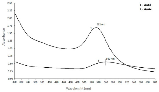 AuNPs display a single absorption peak in the visible range between 510–570 nm, which gives different coloration due to the AuNPs’ size variations [64]. The UV/VIS spectroscopy of AuNPs was measured between 300–700 nm, and the absorbance spectra can be observed from Figure 4. AuNPs showed the maximum absorption band at ~532 nm for AuNPs from AuCl, and at ~560 nm for AuNPs from AuAc. Both absorption bands indicate the stable state of AuNPs. Also, a shift of the SPR peak to a longer wavelength occurred (from 532 to 560 nm), which is related to the differences in the frequency of SPR oscillations of the free electrons [67]. The increase in absorbance is related to the increase in the nanoparticle diameter.