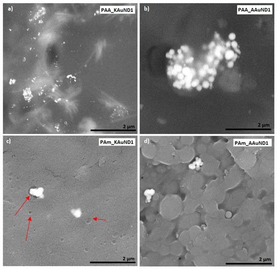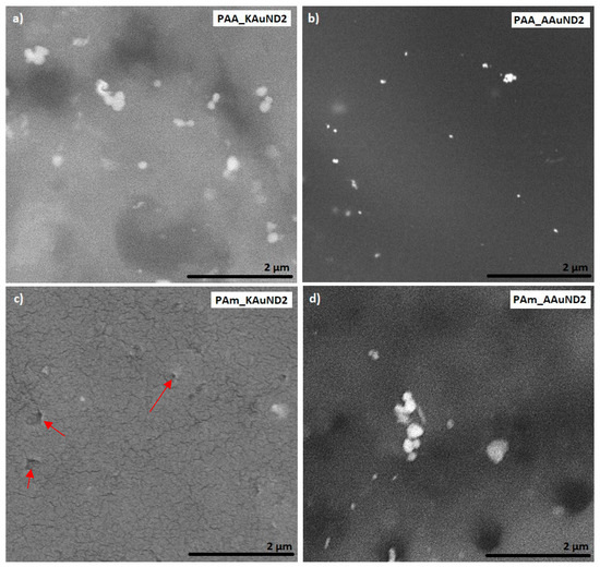 SEM images of prepared polyacrylate-AuNPs’ composites with AuNPs from gold acetate: (a) PAA_KAuND2; (b) PAA_AAuND2; (c) PAm_KAuND2 and (d) PAm_AAuND2. The arrows indicate the locations of the microporosity, where AuNPs are located.