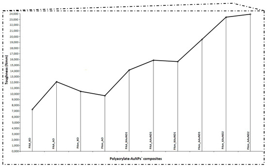 In the case of polyacrylate-AuNPs’ composites based on Am, results show that the density of composite PAm_KAuND1 (Am, initiator KPS and AuNPs from AuCl) increased by 42.1% compared to the density of the control sample (PAm_KO), while the density of the composite PAm_KAuND2 (Am, initiator KPS and AuNPs from AuAc) increased by 2.58% compared to the density of the control sample. The density of composite PAm_AAuND1 (Am, initiator APS and AuNPs from AuCl) increased by 7.03% compared to the density of the control sample (PAm_AO), while the density of composite PAm_AAuND2 (Am, initiator APS and AuNPs from AuAc) increased by 7.19% compared to the density of the control sample.