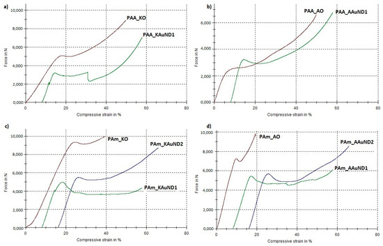 Load-compressive strain curves for tested specimens: (a) PAA_KO and PAA_KAuND1; (b) PAA_AO and PAA_AAuND1; (c) PAm_KO, PAm_KAuND1 and PAM_KAuND2; (d) PAm_AO, PAm_AAuND1 and PAm_AAuND2.