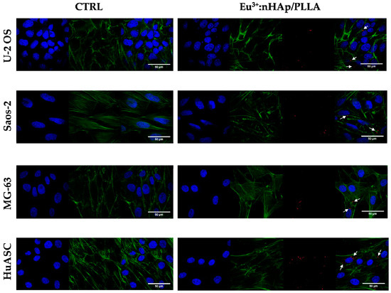 The comparison of cells morphology in control conditions (i.e., on polystyrene/CTRL) and on biomaterial (10 wt % 3 mol % Eu3+: nanohydroxyapatite (nHAp)/poly(L-lactic acid) PLLA. The morphology of cells was visualized using confocal microscope. Cells were stained with DAPI (blue, nuclei) and phalloidin atto-488 (green, actin cytoskeleton). Additionally, in research groups the Eu3+ ions were visualized (red dots – marked by white cursors). Magnification: 630×, scale bar: 50 µm indicated on merged figure.