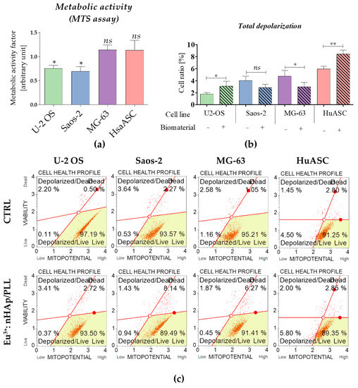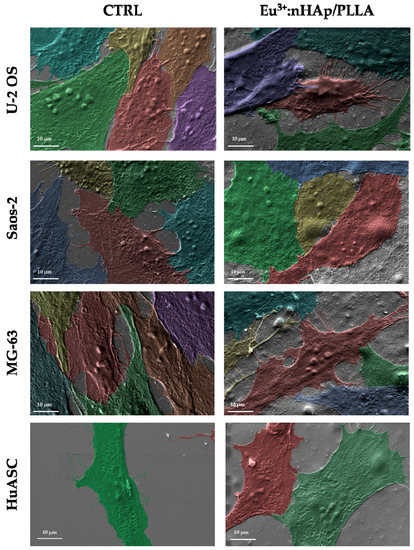 We have also shown that 10 wt % 3 mol % Eu3+: nHAp/PLLA inflects the metabolic activity of HuASC. The analysis of MTS assay indicated that scaffolds slightly improves the metabolic activity of HuASC, what confirmed our previous data [28], however this study revealed that mitochondrial membrane potential of HuASC decreases in cultures on 10 wt % 3 mol % Eu3+: nHAp/PLLA. This might be associated with pro-osteogenic properties of the scaffold that we revealed most recently (data ahead of publishing). In particular, Pietilä et al. showed that during osteogenic differentiation of bone marrow-derived mesenchymal cells the mitochondrial membrane potential decreases, while abundance of rough endoplasmic reticulum is reduced, however without influence on the cells’ viability [62]. This is in good agreement with the results regarding caspases profile. Our study indicated that viability of the progenitor cells is not affected by the scaffold presence—caspase activity was comparable in control and experimental conditions. In turn, in all tested osteosarcomas propagated on the scaffold, the increased activity of caspases was observed, indicating on selective cytotoxicity of obtained matrices. This might be associated with the anti-cancer properties of nHA, but also tumor-selective properties of lanthanides. For instance, LaCit and CeCl3 were shown to inhibit the proliferation of cancer cells but not human embryonal fibroblasts [63,64].