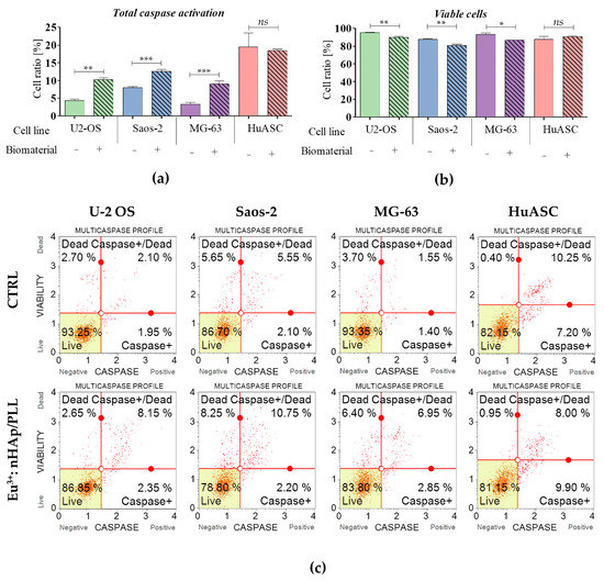 The analysis revealed that biomaterials induce the activation of caspase in all tested osteosarcoma cell lines. The comparative analysis between control and experimental cultures showed significant increase of caspase-positive cells in osteosarcomas propagated in the presence of biomaterial. The carrier has no significant impact on HuASC caspase activation (Figure 3).